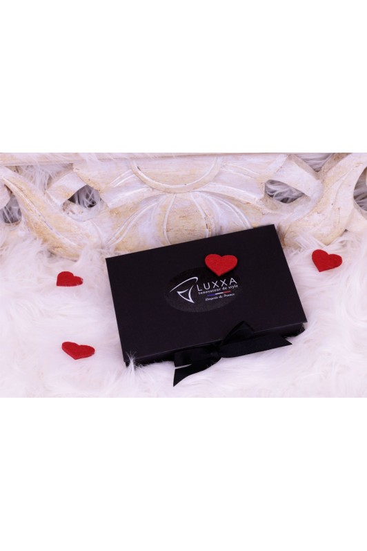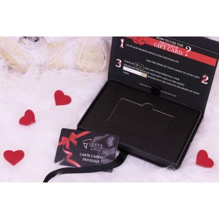 The Luxxa privilege gift card offers you the promise of pleasure and beautiful lingerie. Illustrated with an example of a set and a red flow, this card is wrapped in a specially designed insert. This insert is positioned in a reusable black box, which closes with a black satin bow. To open this gift box, you can relax this bow like a lingerie lacing.